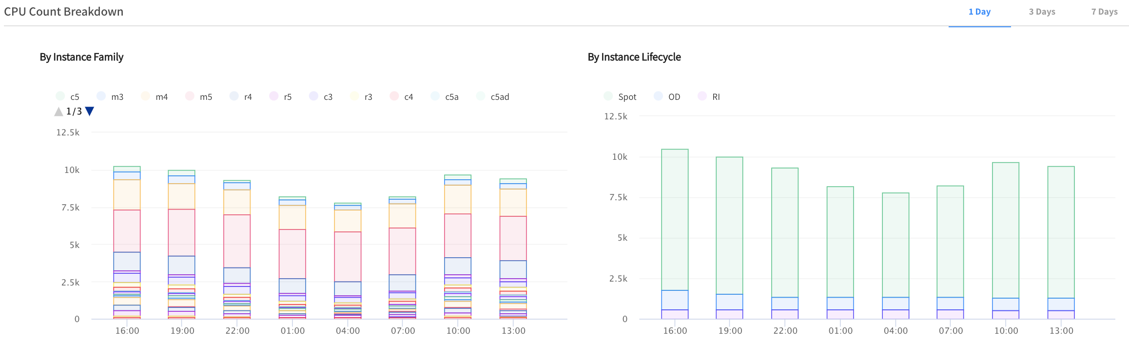 - Running Hours Breakdown: This graph gives a breakdown by lifecycle of the hours your instances are running. Trends plotted include Spot Hours, OD Hours, and Average Instance Count.