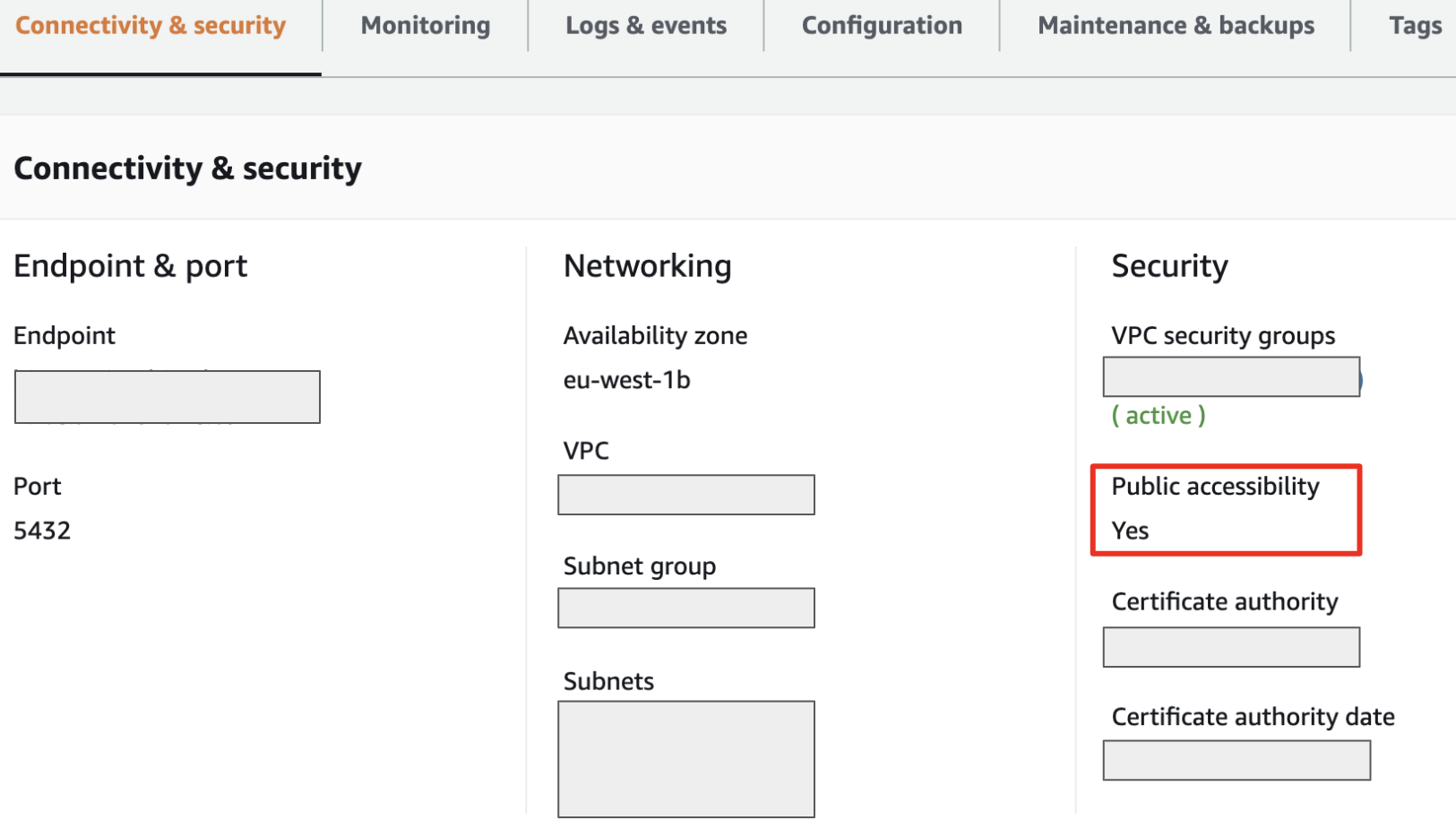 One way to ensure connectivity is to create an inbound rule for TCP on port 5432 and to configure the database to be publicly accessible.