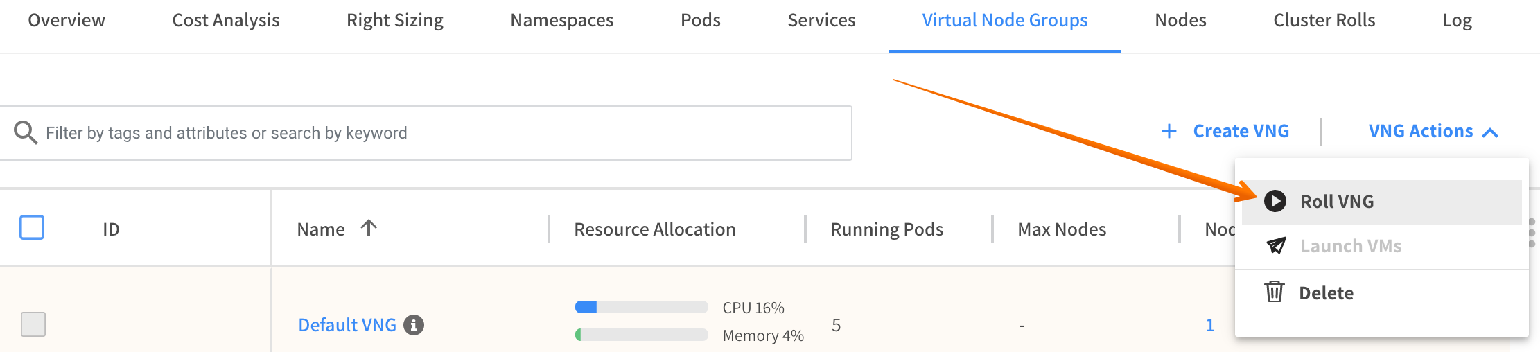 • The launchSpecIds parameter initiates a roll of one or more virtual node groups in the cluster. When you specify a virtual node group ID, all the nodes in that virtual node group are rolled.