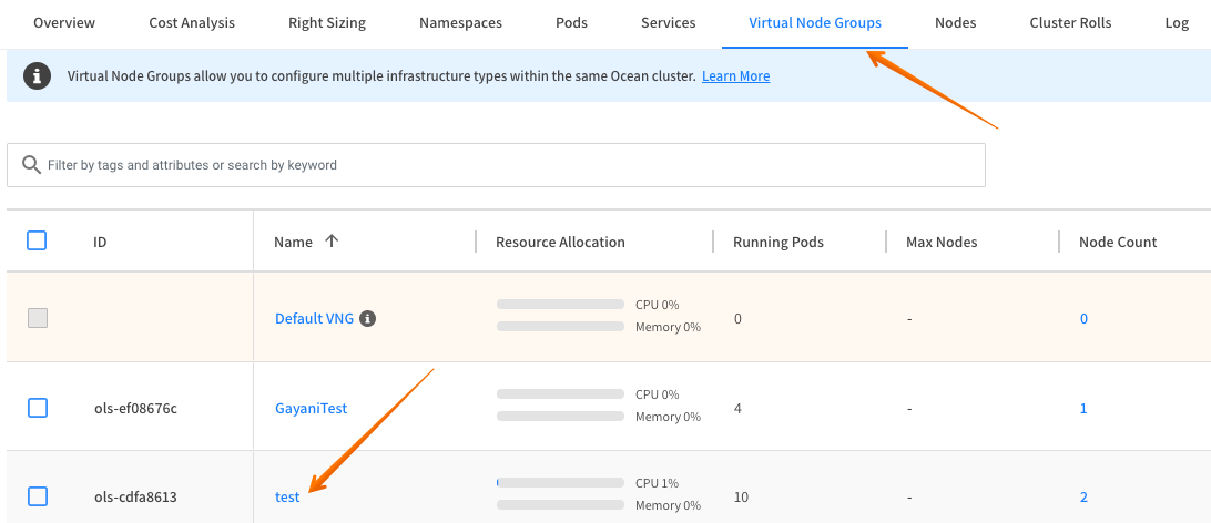 - To edit the configuration of a VNG, go to the Virtual Node Groups tab and click on the Name of the VNG.